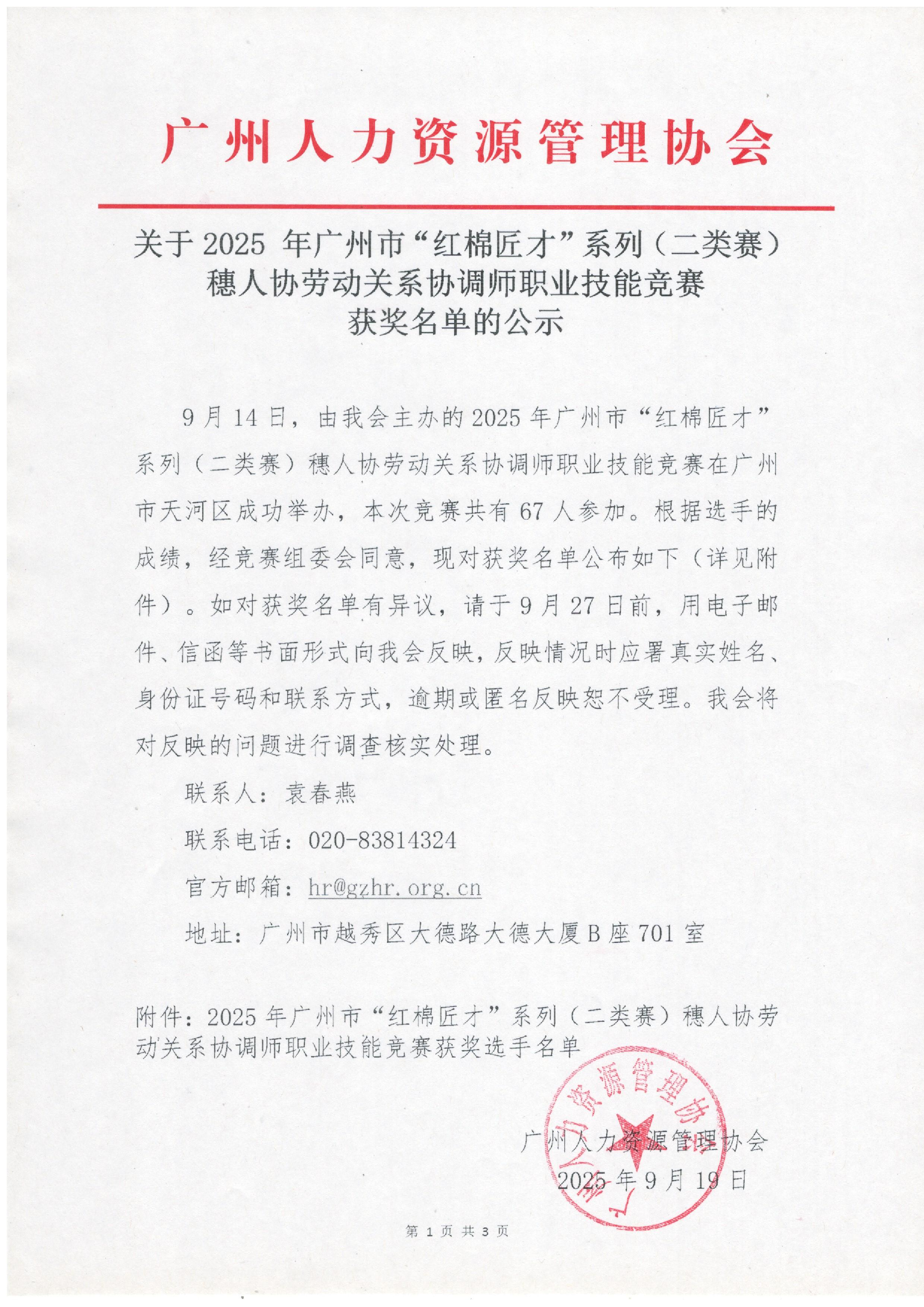 2025年广州市“红棉匠才”系列(二类赛)穗人协劳动关系协调师职业技能竞赛获奖名单的公示
