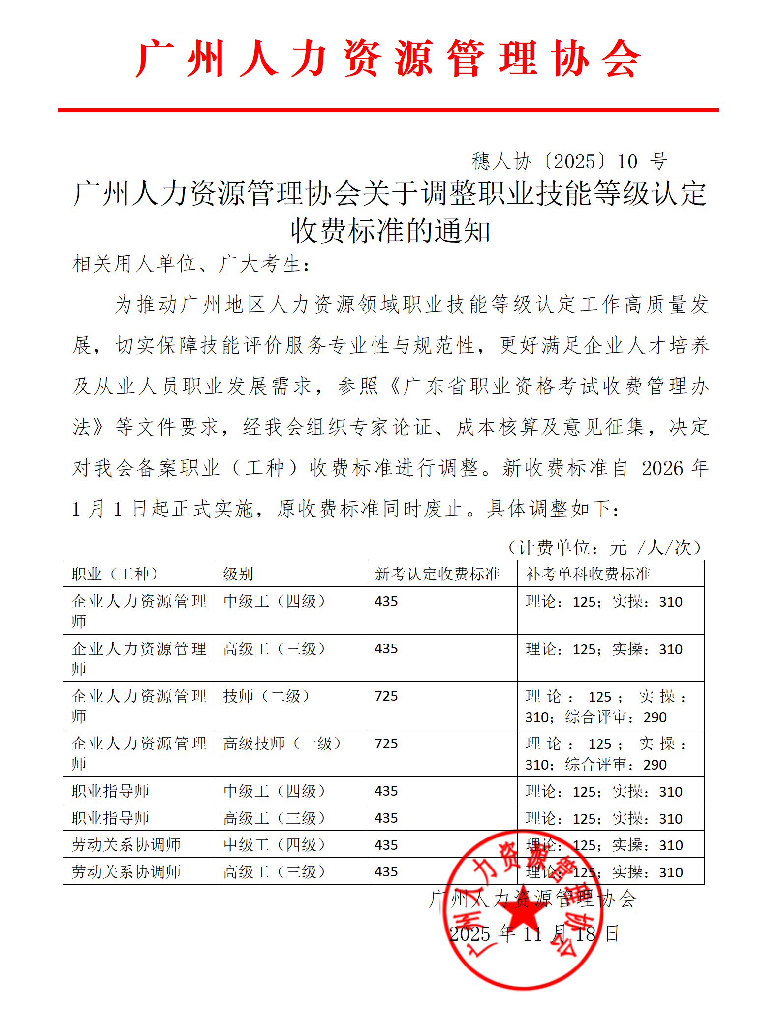 广州人力资源管理协会职业技能等级认定收费标准调整结果公示